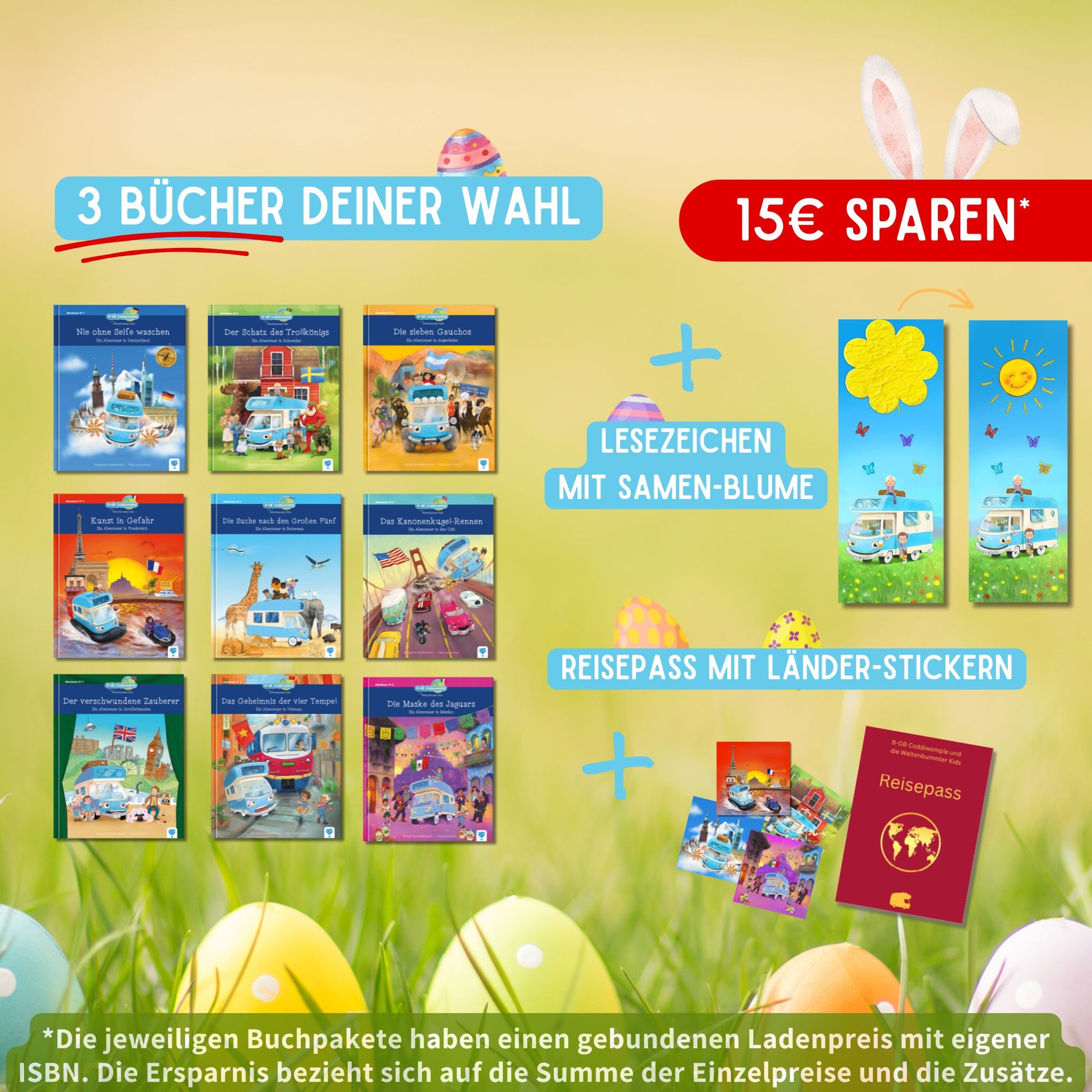 Hinweis zur Buchpreisbindung: Bei diesem Angebot handelt es sich um eigenständige Bücher-Pakete. Jede mögliche Buch-Kombination bildet eine feste Verkaufseinheit mit einer eigenen ISBN und einem festen, gebundenen Ladenpreis. Der ausgewiesene Paketpreis ist gemäß Buchpreisbindungsgesetz verbindlich. Die Ersparnis ergibt sich aus der Differenz zum summierten Einzelkauf der enthaltenen Titel sowie dem Wert der exklusiven Beigaben (Samenblumen-Lesezeichen, Lese-Reisepass und Ländersticker). Eine vollständige Übersicht der ISBN-Zuweisungen für alle möglichen Kombinationen gibt es [HIER in unserem Preisbindungsverzeichnis].